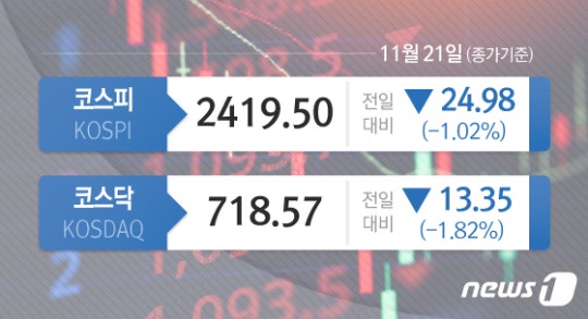 [시황종합] 코스피, 1.02% 하락한 2419선 마감…”中 코로나 리스크에 투자심리 위축”